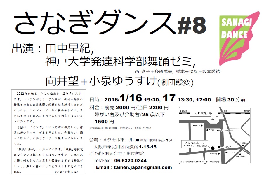 劇団態変の本拠であるメタモルホールで、2012年7月からスタートした、ダンス公演企画です。障がいを持った身体/持たない身体が、等価にしのぎを削る、稀有な空間として、回を重ねるごとに、大きく変態(メタモルフォーゼ)を遂げるでしょう。